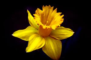 A daffodil captured in radiant detail against a deep background. This image celebrates spring's arrival in vivid contrast. A subtle watermark is included, though barely visible on the final print.