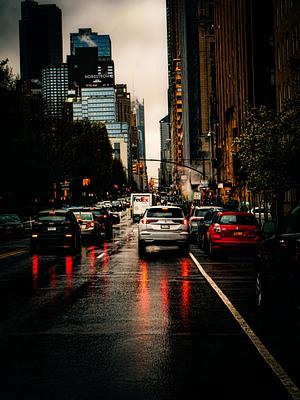 Captured near Central Park on a rainy afternoon in New York City, this image reflects the rhythm of urban life, tail lights glowing against wet pavement, framed by towering buildings and moody skies. A subtle watermark is present for copyright protection.